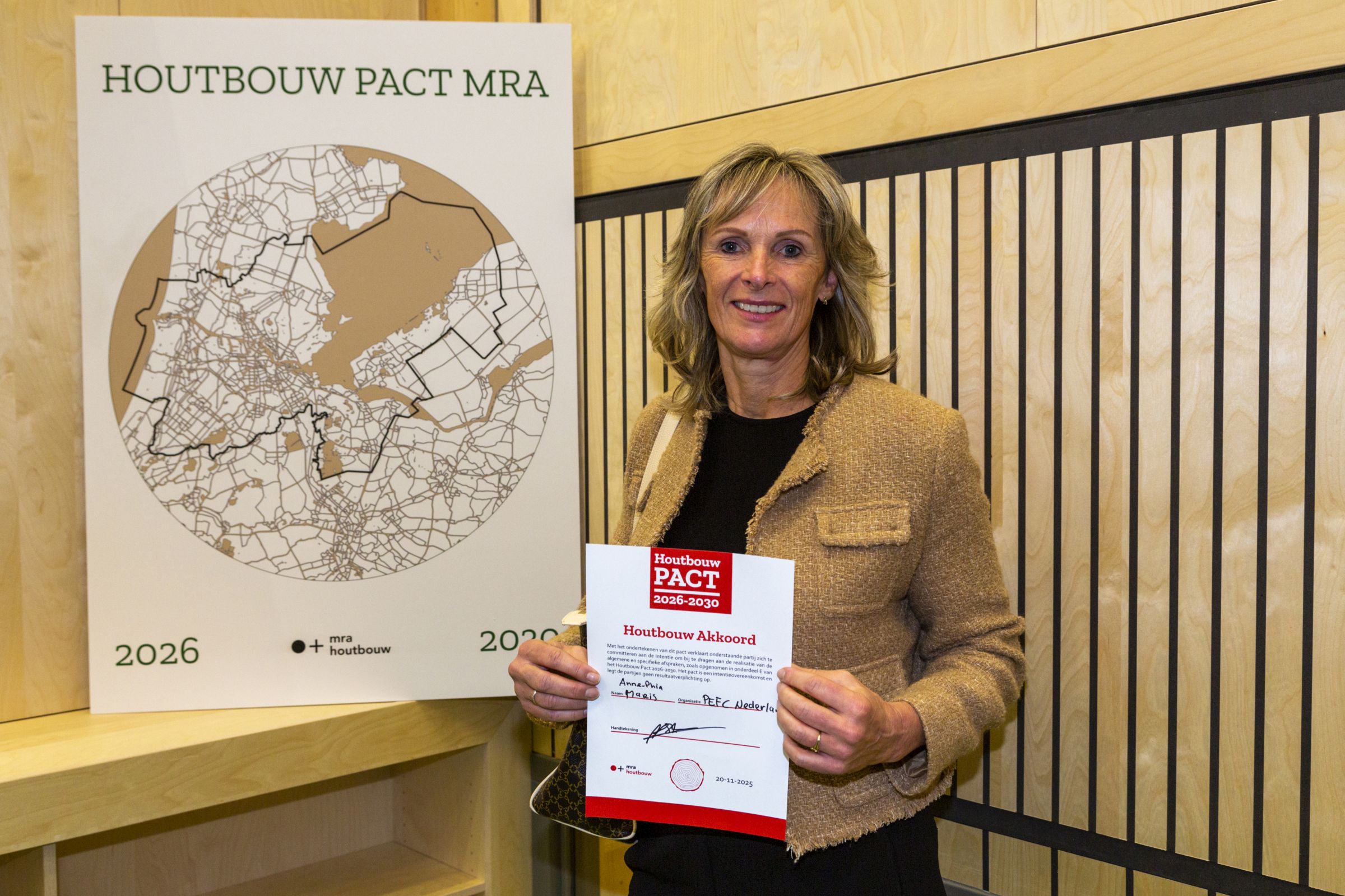 Bestuurslid Anne-Phia Maris heeft namens PEFC Nederland de MRA Houtbouw Pact 2026-2030 ondertekend.